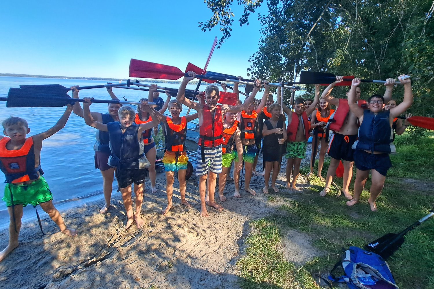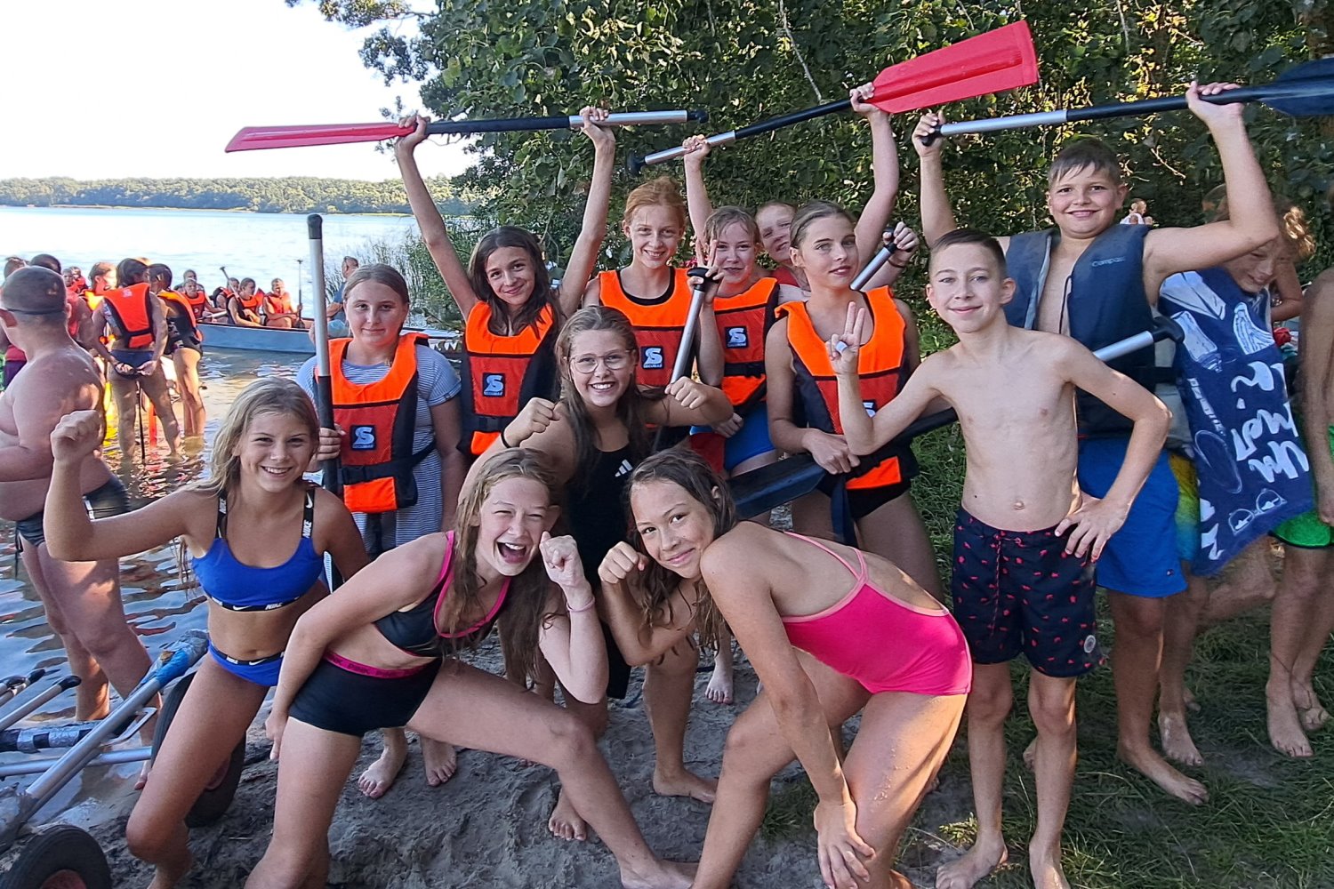 Der zweite Tag stand im Zeichen der Teambildung. Bei den Team-Spielen konnten die Schüler hautnah erfahren, wie Gruppenprozesse funktionieren. Trotz des spielerischen Charakters wurde schnell klar, dass die Gruppendynamik kein Spiel, sondern manchmal bitterer Ernst ist. So kullerte zuweilen eine kleine Träne, wenn man als Teamsprecher kritisiert und die gut gemeinte Hilfe missverstanden wurde. Spätestens, als die Klassenlehrerinnen sich beim Mattenrutschen aktiv beteiligen mussten, war die gute Stimmung wiederhergestellt. Am Nachmittag (Auf das Mittagessen soll an dieser Stelle nicht mehr eingegangen werden 😊) führte ein anderthalbstündiger Spaziergang zum Höhepunkt der Klassenfahrt: dem Drachenbootrennen. Nach einer relativ kurzen, aber sehr effektiven Einführung im Umgang mit dem Stechpaddel traten die beiden Drachenboote, die jeweils mit 20 ehrgeizigen Paddlern besetzt waren, gegeneinander an. Den Strandbesuchern, die sich auf ein paar ruhige Minuten am Ufer des Arendsees eingestellt hatten, wurde am heutigen Tag eine andere Szenerie geboten: Aufgeregte Schüler wechselten Kleidung gegen Schwimmwesten, machten bereitwillig und einsichtig Liegestütz, wenn sie den Anweisungen nicht folgten, und zählten rhythmisch bei jedem Paddelschlag mit, um das Boot zügig voranzubringen. Die Lautstärke des Jubels, wenn ein Rennen gewonnen wurde, ließ bei den Zuschauern jegliche Hoffnung auf einen entspannten Strandbesuch verfliegen. Wir hingegen wussten, dass wir mit diesem Programmpunkt alles richtig gemacht hatten.