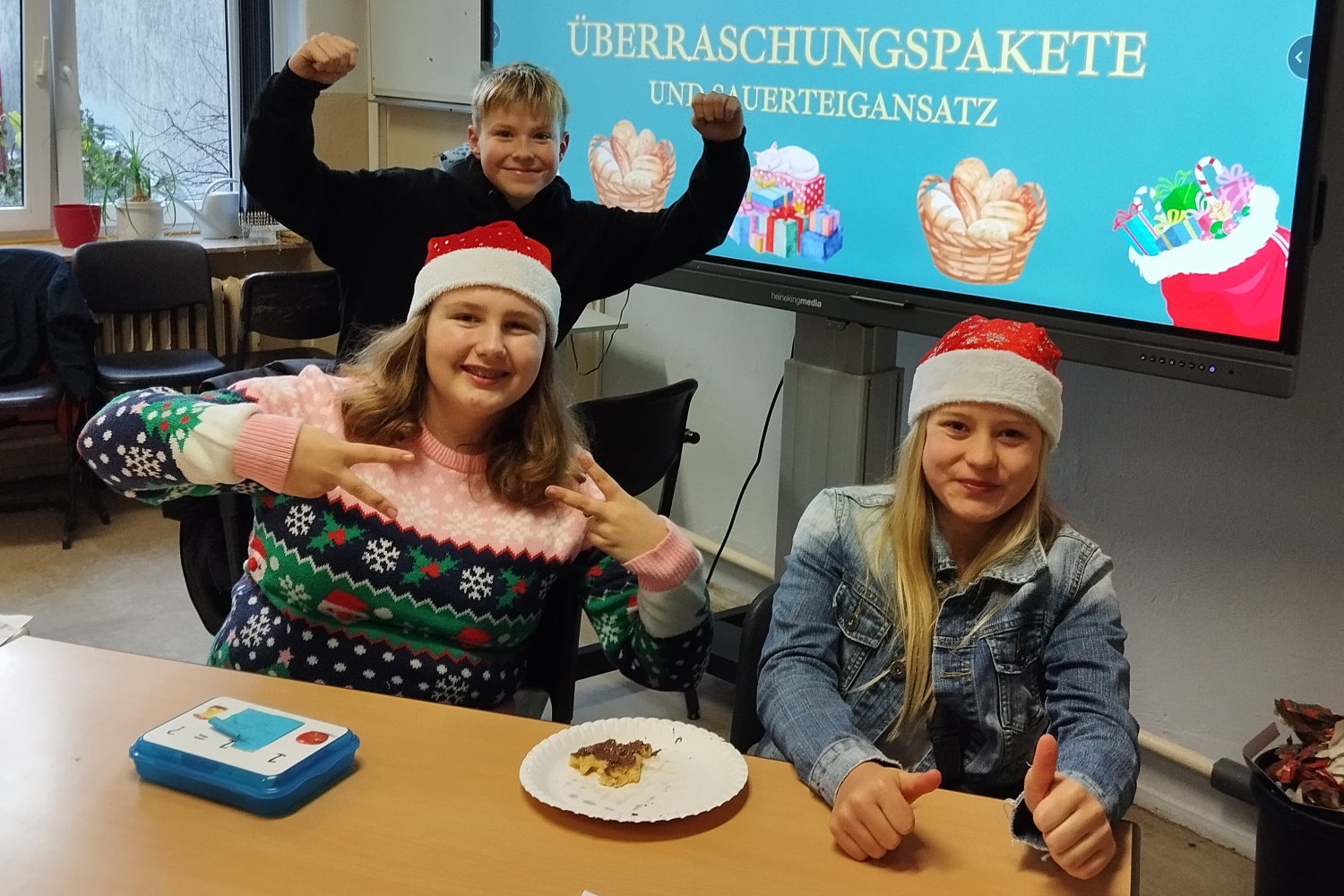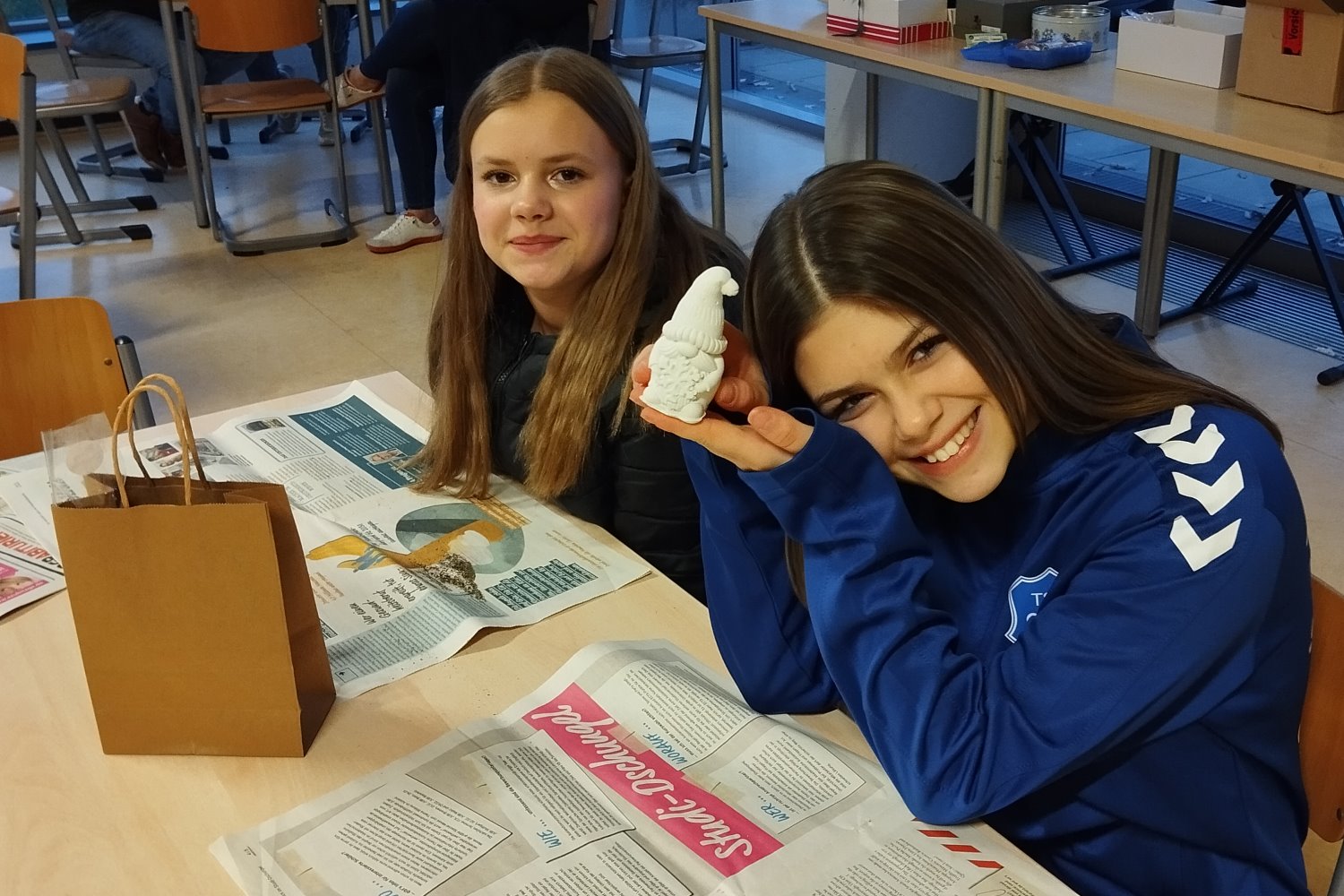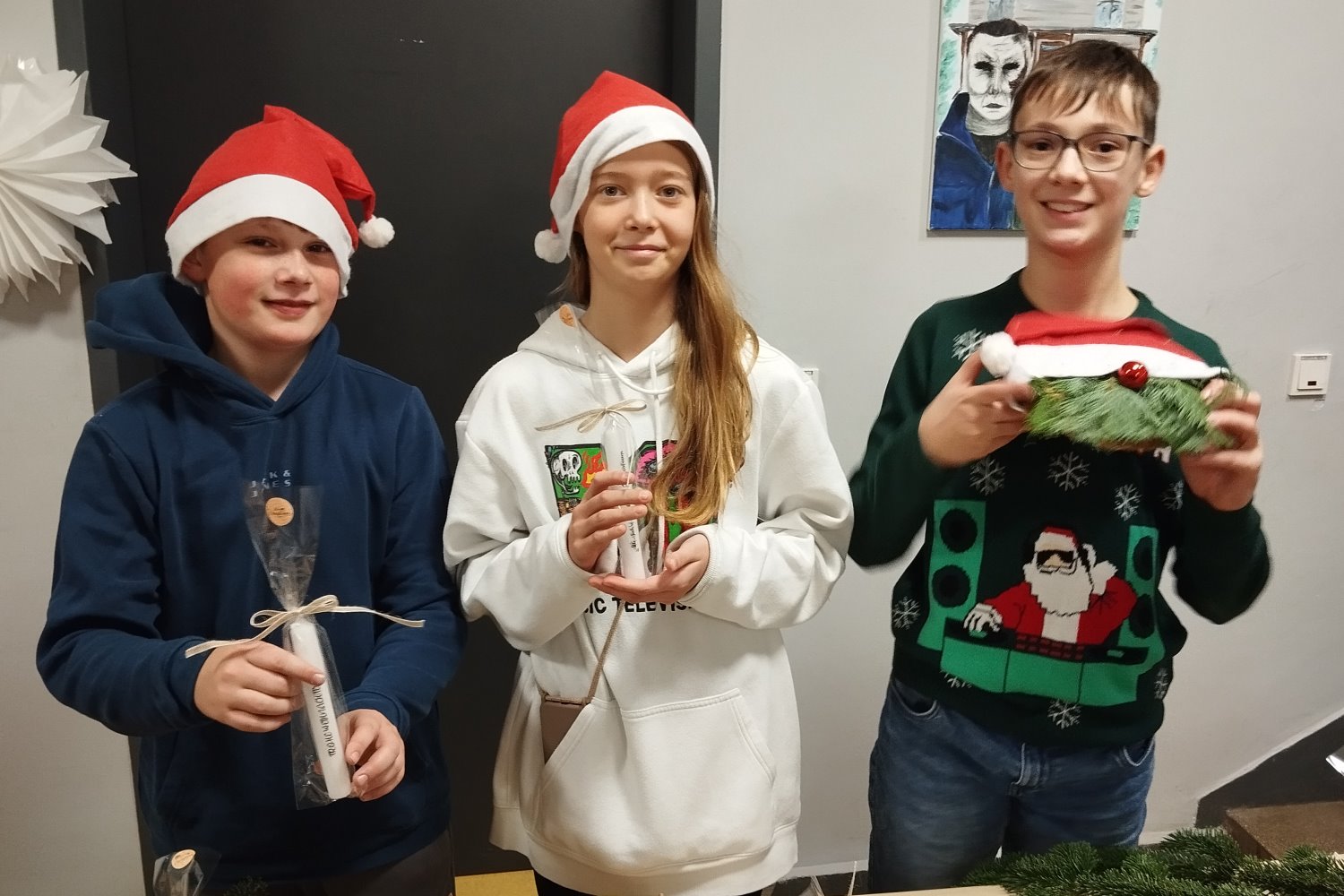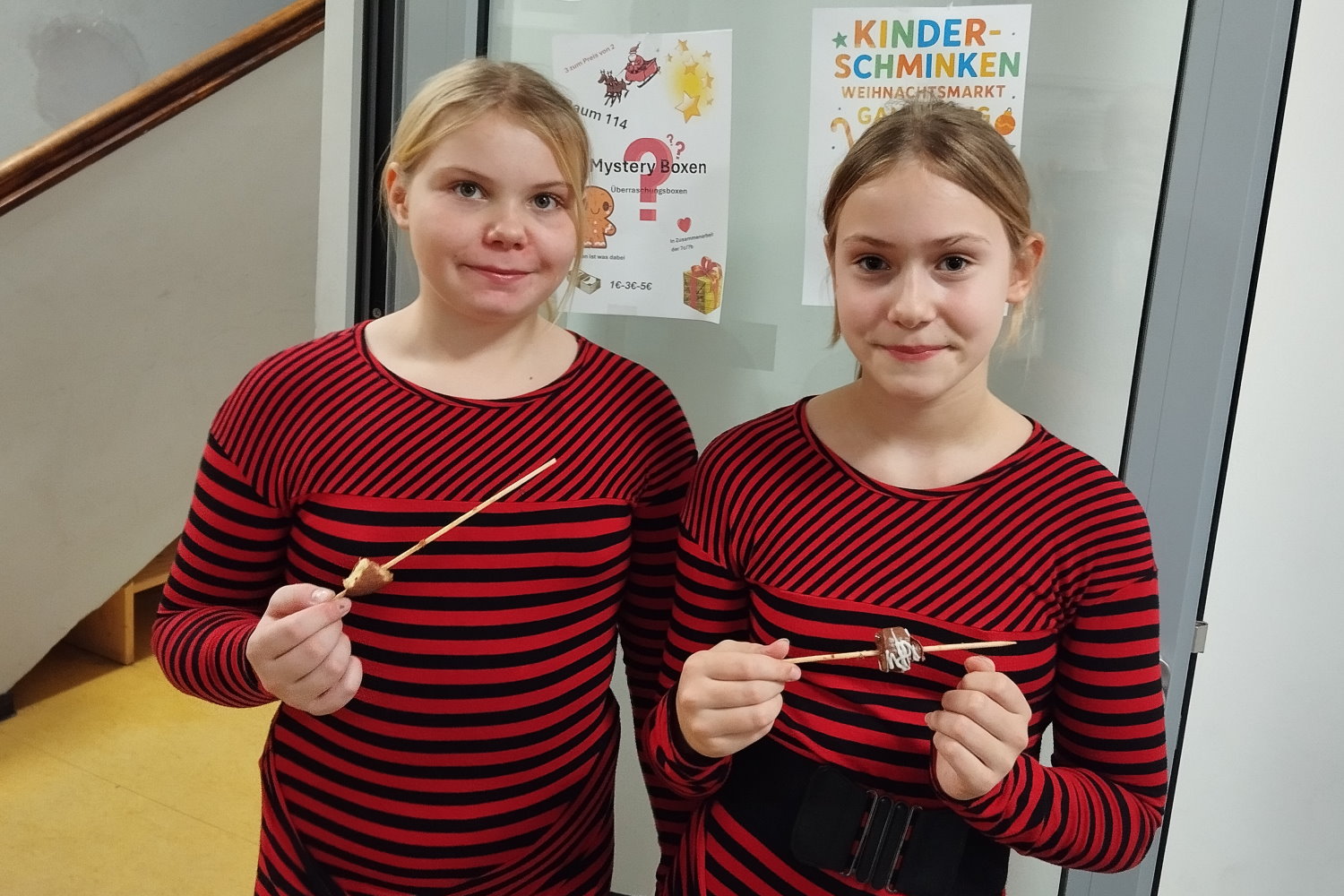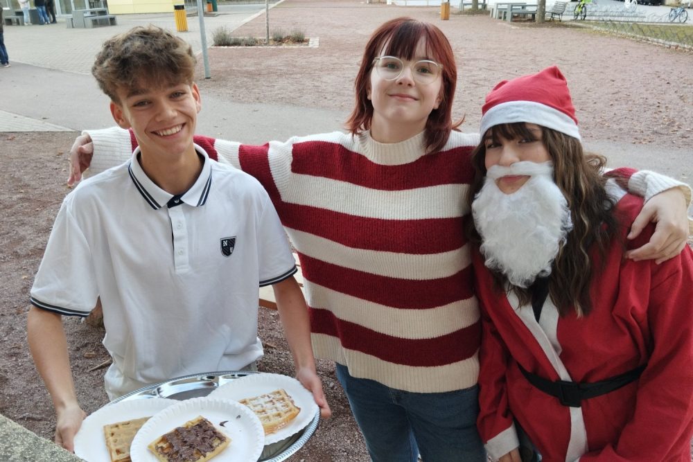 Auch der umrahmende Weihnachtsmarkt offenbarte das großartige gemeinsame Engagement. Frische Waffeln, Kinderschminken, Überraschungsboxen, Grillwurst, Pommes Frites, Kinderpunsch, Ofenkartoffeln, handgemachte Weihnachtsdekorationen, Glücksrad und Schokofrüchte, Losbox, reichlich Kuchen und Kaffee beschreiben die vielfältigen Angebote, betreut von Schülern mit ihren Lehrern.