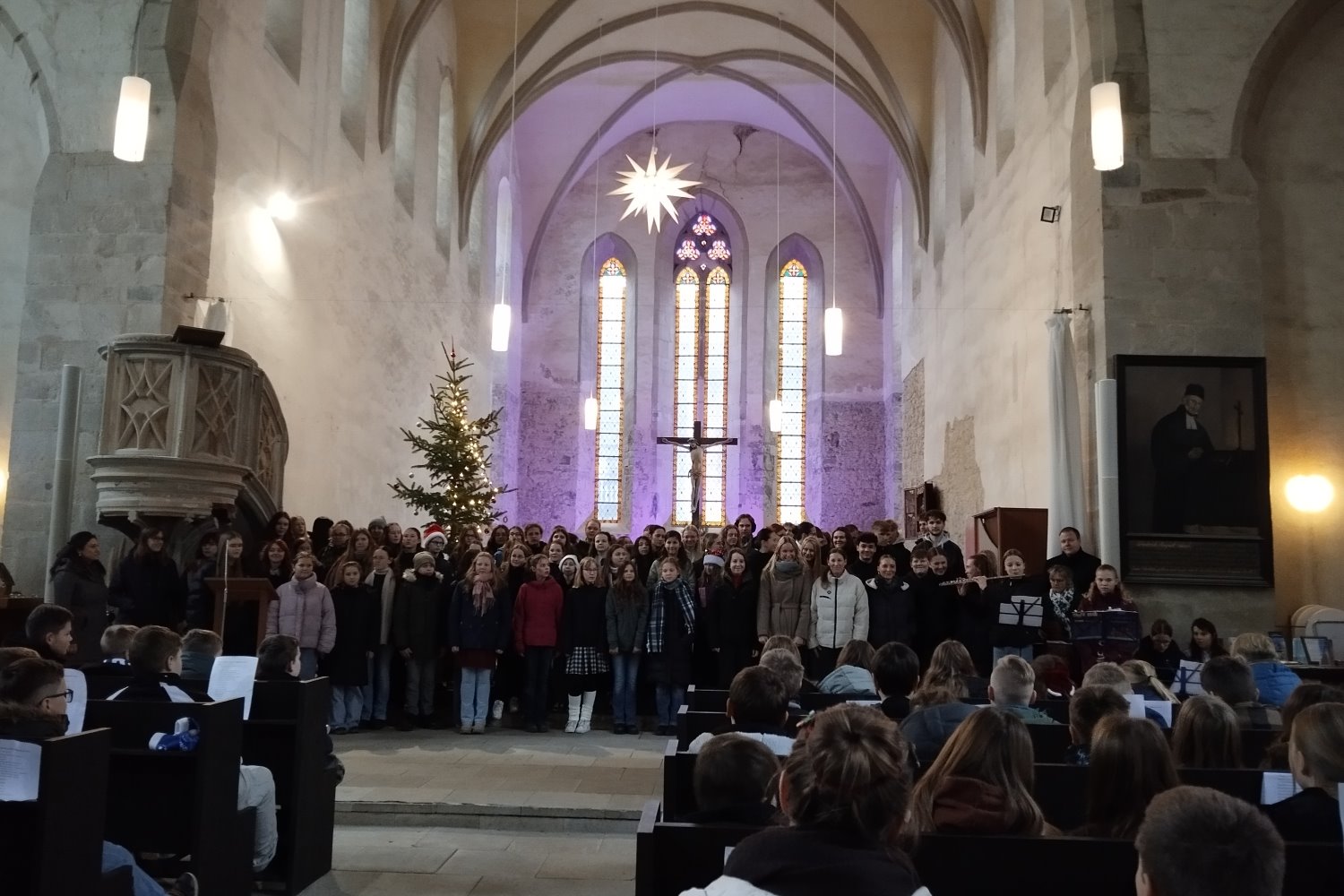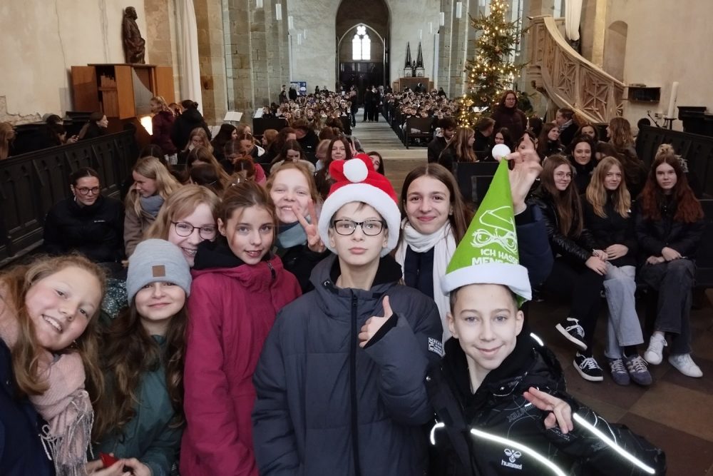 Schnell waren alle Plätze besetzt, sodass einige dem Programm stehend beiwohnen mussten, aber es hatte sich in jedem Fall gelohnt. Neben Orgelklängen von Religionslehrer Sascha Wenzel, den Grußworten vom Pfarrer und der Weihnachtsgeschichte, sorgten ein Gedicht von Schülern der fünften Klasse und den „Empfehlungen eines Kindes“ des Religionskurses der achten Klasse für eine schöne Stimmung. Die besondere Akustik der Kirche nutze der große Schulchor für seinen Programmteil und sorgte mit dem Einlaufen und den Weihnachtsliedern für Gänsehaut-Atmosphäre.