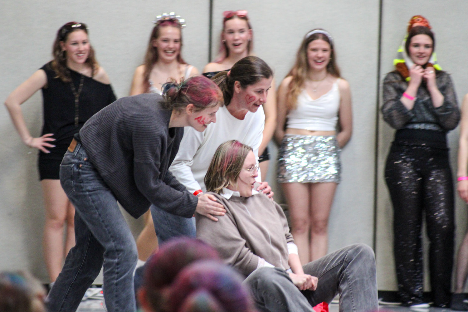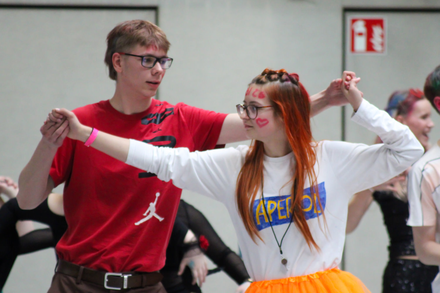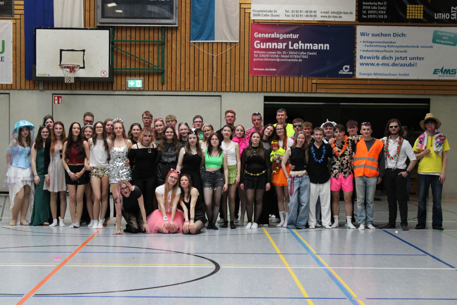 Viele bunte Lichter und discoähnlich abgedunkelte Flure begrüßten die von den 12ern geschminkten Schilleraner. Nach einer gemeinsamen Tanzeinlage in der Hofpause folgte der Wechsel in die Partylocation „Sporthalle“. Leandra Bartels und Niklas Wolter begrüßten, mit ihrem Partyteam im Hintergrund, die Schulgemeinschaft mit den Worten: „Hier erwarten euch nun Spiele mit einigen peinlichen Momenten und reichlich Party.“